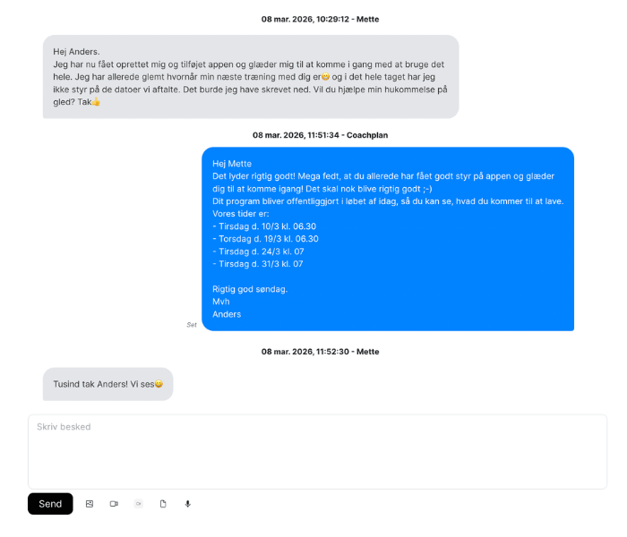 Coachplan er en dansk alt-i-en platform til personlige trænere, online coaches og fysioterapeuter. Platformen samler træningsprogrammer, kostplaner, klientjournaler, beskeder, betalinger og meget mere i ét system — så du kan spare tid og levere en professionel oplevelse til dine klienter.