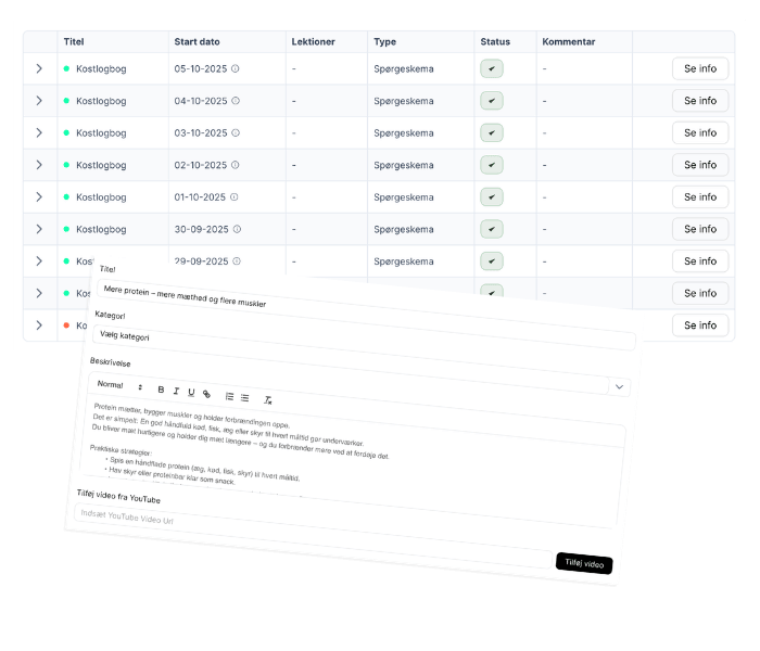 Automatisér programtildeling, påmindelser og check-ins, så du bruger din tid på coaching i stedet for administration.