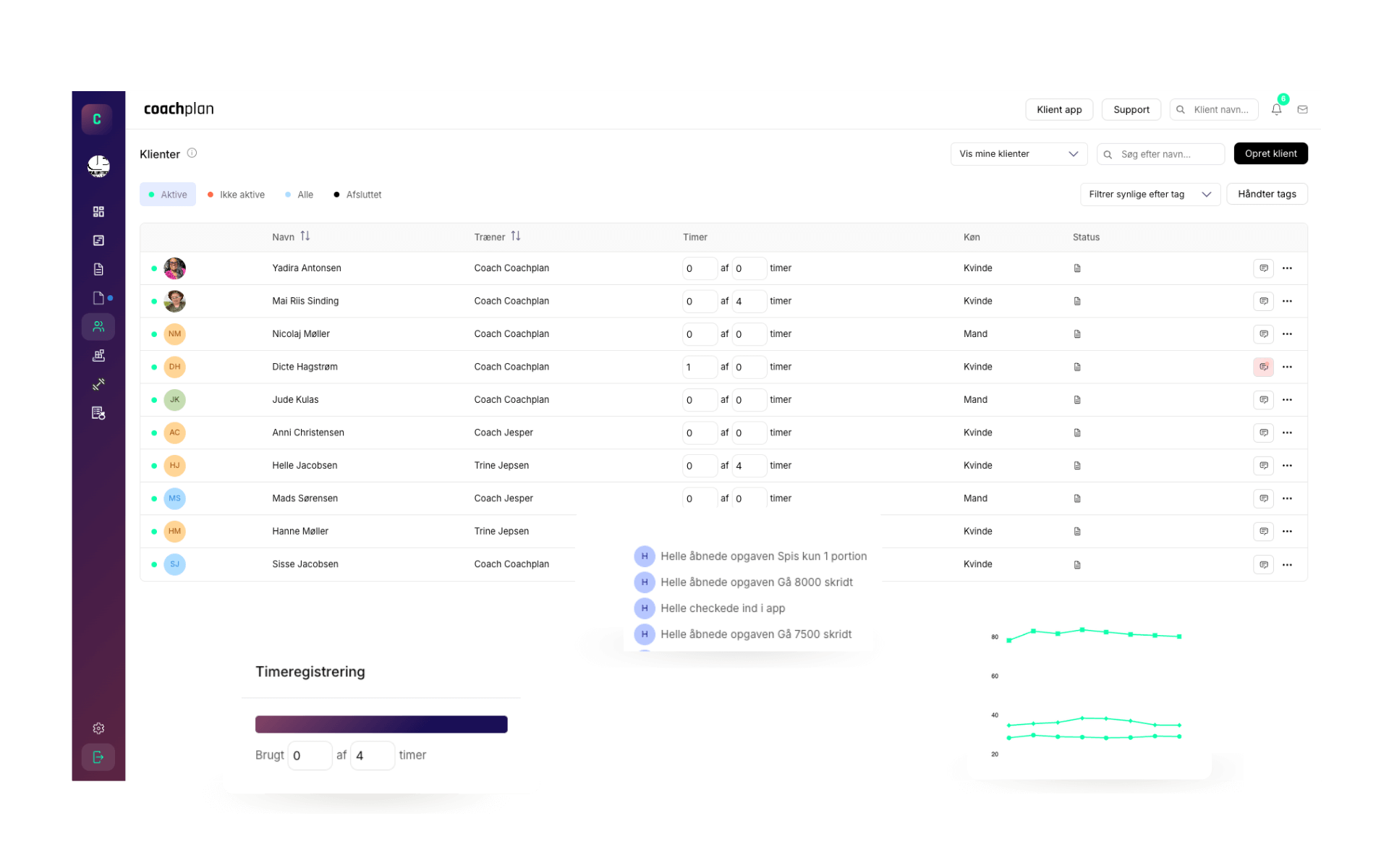 Se klientens aktivitet i realtid. Send beskeder, giv feedback og juster planer baseret på data — ikke gætterier.